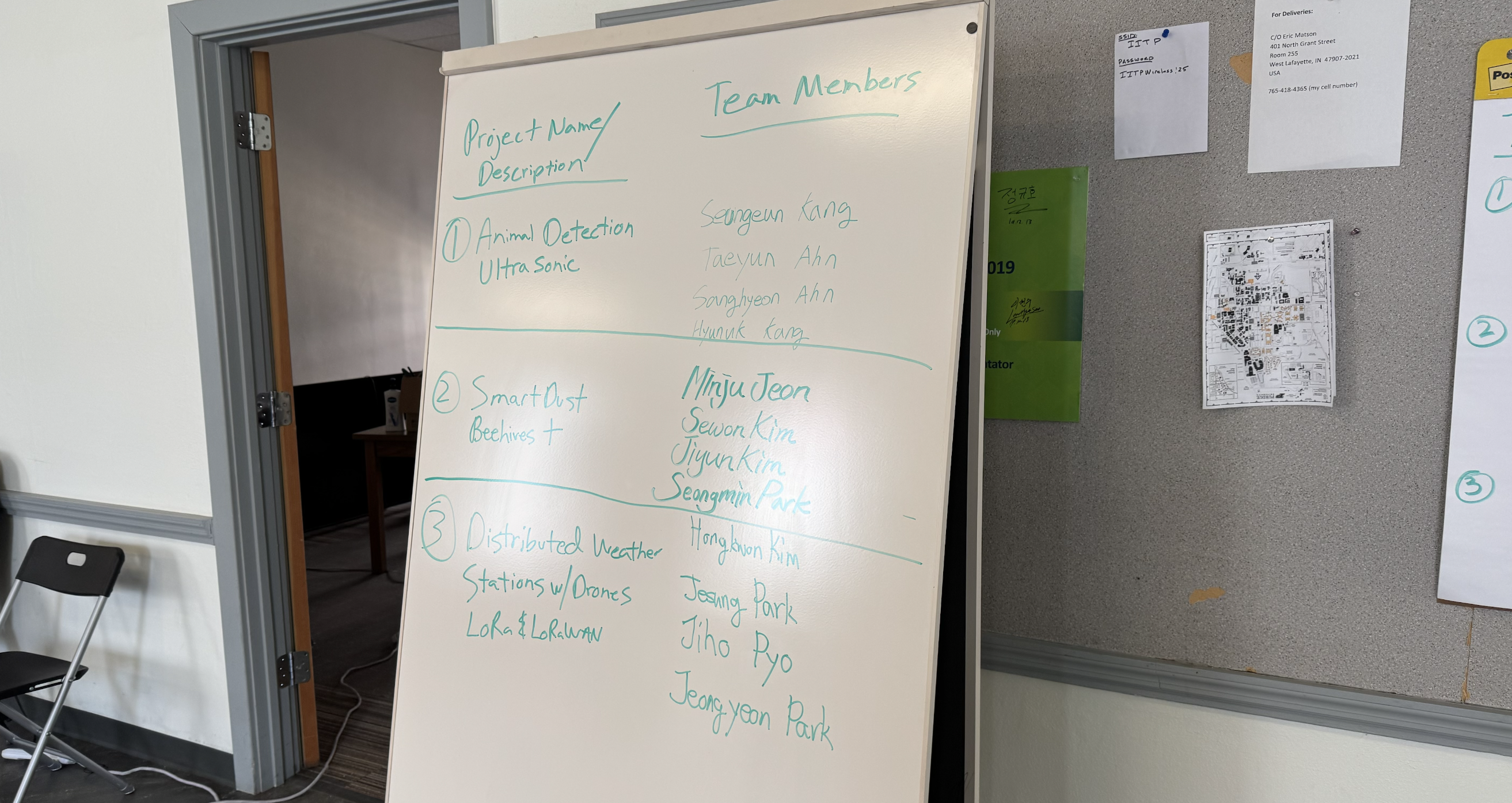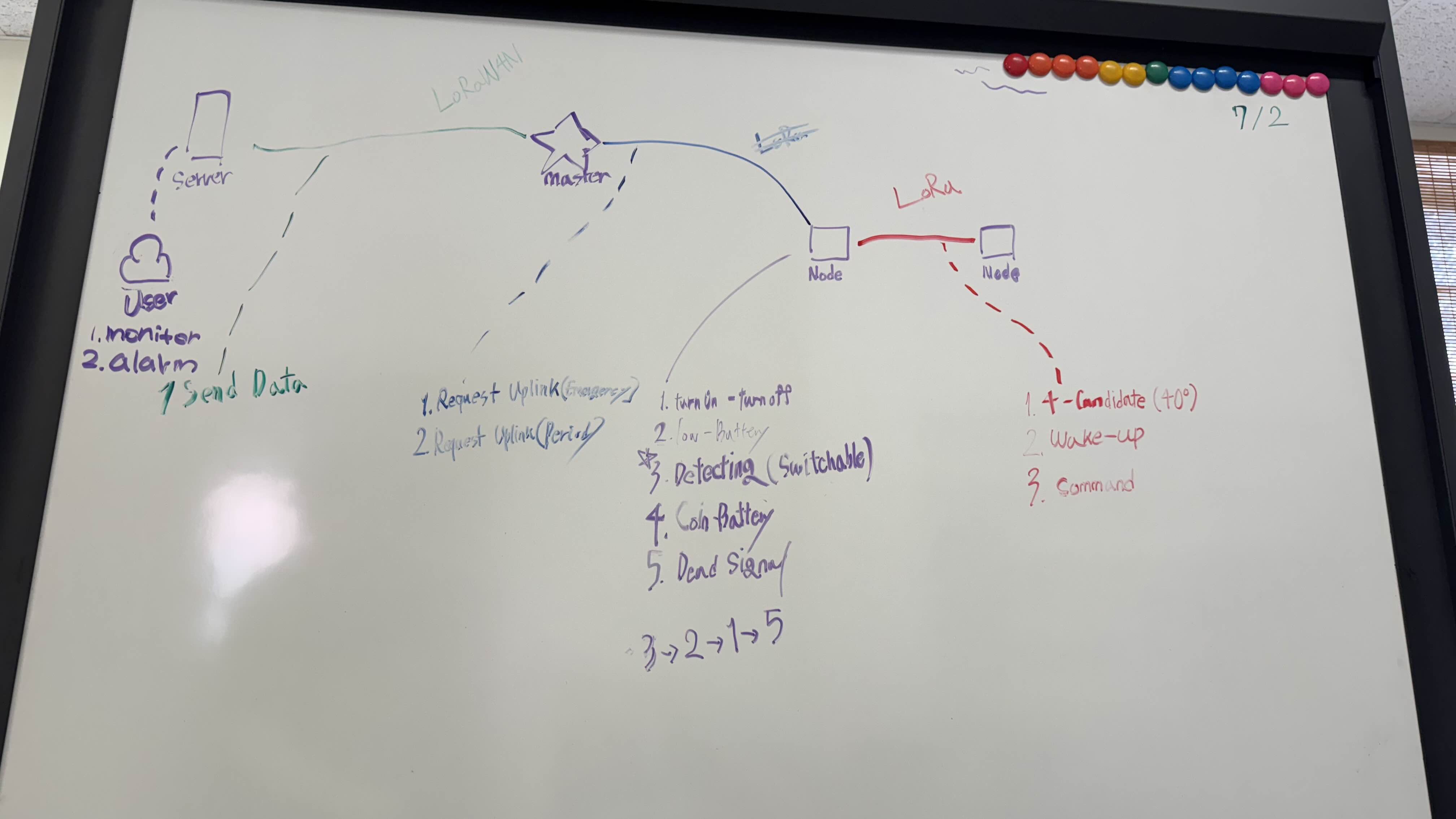 이 날 오전, 모두 화이트보드 앞에 모여 대화를 시작했습니다. 기술명세서 작성을 위하여, 지금까지 나누었던 아이디어를 글과 그림으로 정리했습니다. LoRa를 사용한 노드와 마스터노드간 통신, 그리고 서버와 유저까지 이어지는 아키텍처를 구상했습니다. 거기에 각 디바이스에 필요한 기능들 또한 정리했습니다.
