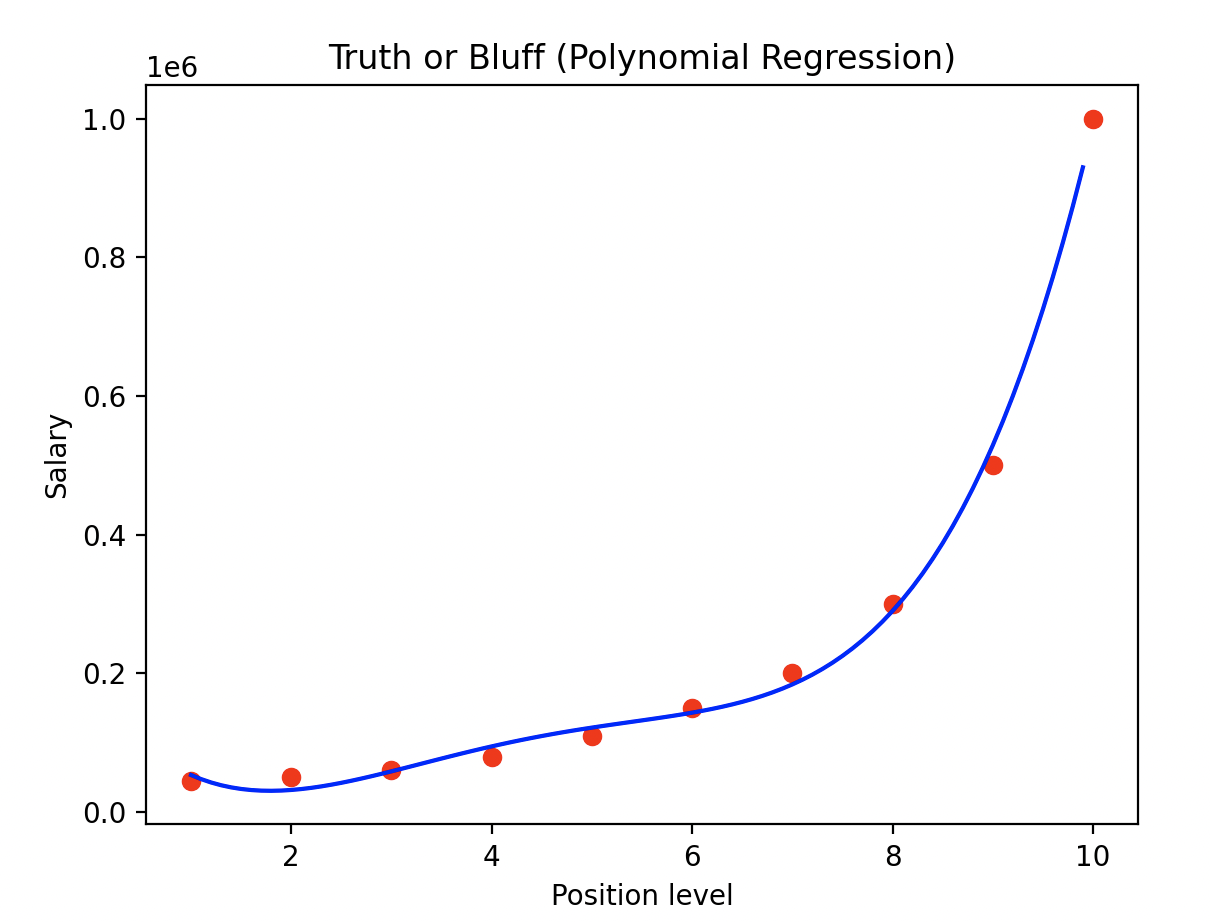 이러한 상황에서 우리는 위와 같은 B 회사의 봉급 표를 가지고 있습니다. 그렇다면 그의 이야기가 진실인지 허풍인지 알 수 있을까요? 이를 위해서 우리는 다항식 선형 회귀 모델을 사용해 볼 수 있습니다.